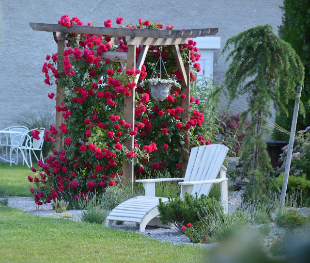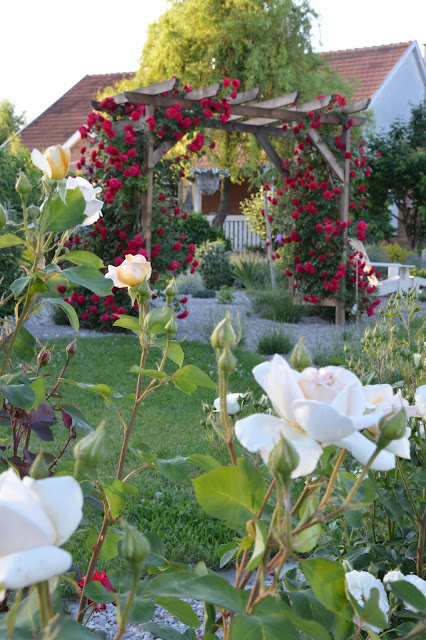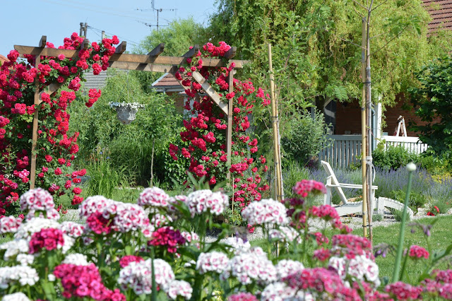 Ako prvá, nás svojou krásou ohúrila červenou ružou obrastená pergola. Boli to staré korene ruží, preto im na to, aby vyrástli do takejto krásy, stačilo 1,5 roka.