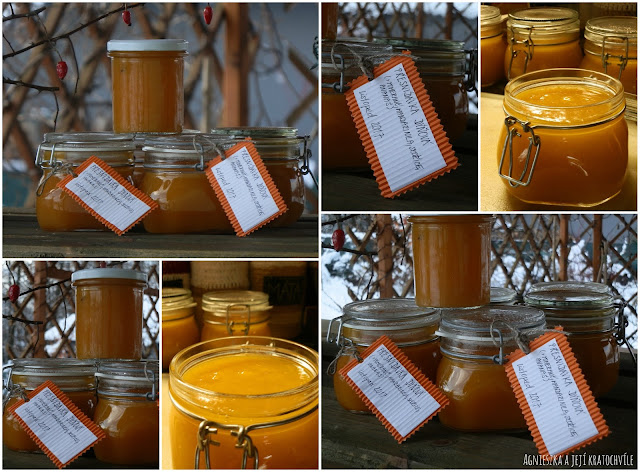 Samozřejmě dýni 🙂 Té jsem dala 2,4 kg (oloupané), pak 1 x mandarinky v malé konzervě (312 g), 1 x ananas ve velké konzervě (567 g), šťávu ze 2 pomerančů, šťávu ze 2 citrónů, lžíce nastrouhaného čerstvého zázvoru, 3 kusy celé skořice, lžička mleté skořice na dochucení, špetka kyseliny citrónové, 300 – 400 g cukru (podle chuti, každý má rád jinak sladké) a pektin, gelfix 2 v 1, agar ap. na zahuštění.