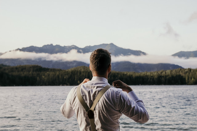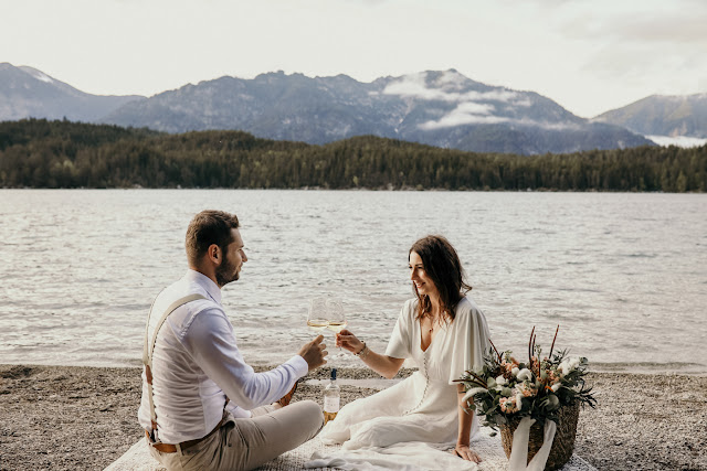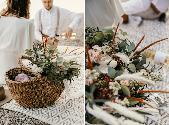 Na poslední část jsme se vrátily k autu pro dekorace a oblek a přesunuli se všichni na druhou stranu k nedaleké pláži, kde jsme si počkali na krásný západ slunce. Bylo to nádherné, jak se po dešti zvedala všechna ta pára směrem vzhůru a vytvořila závoj kolem vrcholků. Všude byl najednou klid, nikde skoro ani noha a to i přesto, že to pondělí byl v Německu státní svátek. Konečně jsme to tu měli jen pro sebe. Otevřeli jsme vínko, rozložili deku a koberec a užívali si během focení ten krásný výhled. Vzala jsem s sebou i naše snubní prstýnky od 27jewelry. Chtěla jsem mít tuhle předsvatební vzpomínku kompletní. Aspoň jsme si to nasazování otestovali nanečisto. Ono to stejně u toho oltáře bylo úplně jiné a prožívali jsme to jinak, takže jsme se vůbec o nic neochudily.