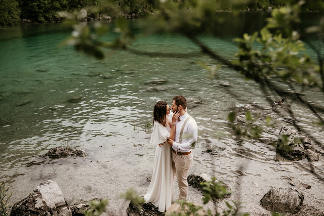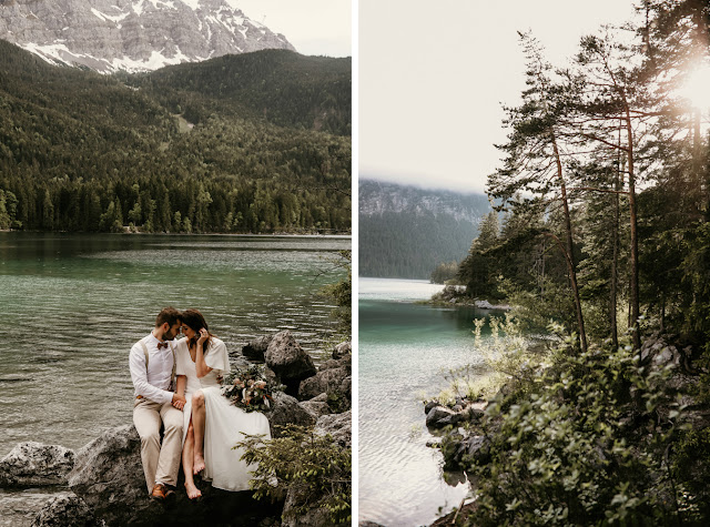 My se vydali k německému jezeru Eibsee. Leží v Bavorsku, zhruba hodinu pod Mnichovem, z Prahy se sem dostanete za 5 hodin jízdy autem. Proč zrovna tohle místo? Protože tohle jezero obklopené horami je naživo úplně pohádkové, ty scenérie vás prostě dostanou. Tyrkysová křišťálová voda, lesy, kamínkové pláže a bílé vrcholky zasněžených hor, pro nás dva to je láska. Milujeme hory, jezdíme každý rok v létě někam na túry a já doslova hltám každý výhled za odměnu po náročném výšlapu. Jenže představa, že se takhle někam belháme s šaty a fotografem za pohádkovým výhledem, nebyla moc reálná. Chtělo to místo, které bude dostupné autem a budete mít okolí hned jako na dlani. Eibsee je na tohle ideální lokace. Zaparkujete hned kousek od vody a jste na místě. Žádné trmácení nahoru. Celé jezero se dá hezky obejít po pěšinkách bez velké námahy, takže parádní místo na uskutečnění něčeho takového.