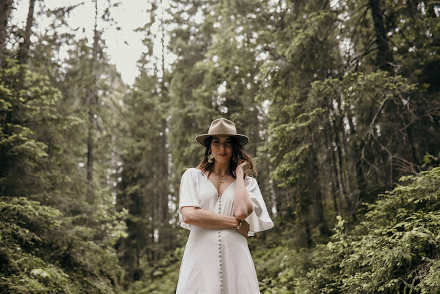 Cca měsíc před termínem jsem vymýšlela detaily na focení. Díky Alex jsem dostala kontakt na Zuzku Kedroňovou z Yoora Studio, která vytváří krásné svatební šaty z mírumilovného hedvábí a dalších přírodních materiálů. Přemýšlela jsem, že bych si na předsvatební focení stihla ušít ještě nějaké šaty, ale nakonec jsem byla ráda, že jsem se se Zuzkou domluvila na zapůjčení, protože jsem toho měla fakt nad hlavu a stejně bych ty své nestíhala dokončit. Vybrala jsem model Baja s véčkovým výstřihem a zapínáním na knoflíčky v celé délce. Mají přinechané volánkové rukávky a dají s nosit s výstřihem vepředu i vzadu na zádech. Jsou podšité bambusem a dokonalé v každém detailu. Když jsem si je u ní v Emeraldu zkusila poprvé, věděla jsem, že to na focení bude přesně ono. Jsou jednoduché a díky tomu se dají nastylizovat na spoustu způsobů.