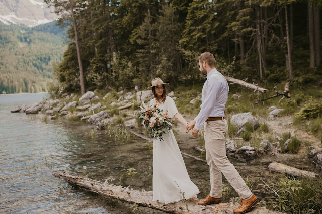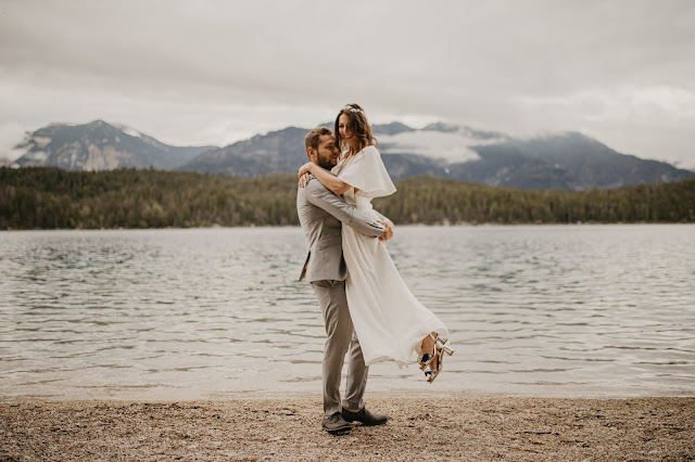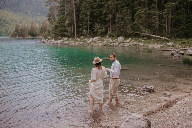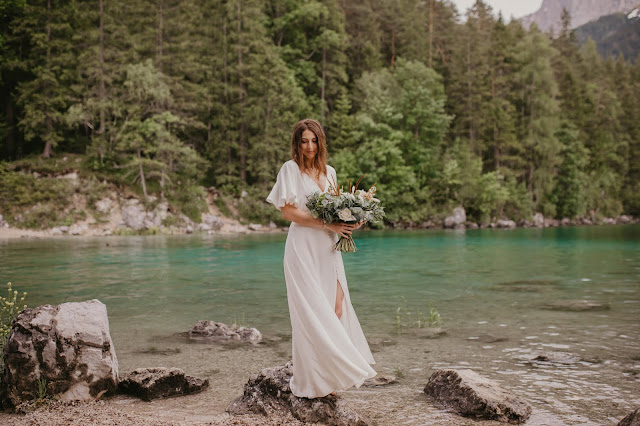 My se vydali k německému jezeru Eibsee. Leží v Bavorsku, zhruba hodinu pod Mnichovem, z Prahy se sem dostanete za 5 hodin jízdy autem. Proč zrovna tohle místo? Protože tohle jezero obklopené horami je naživo úplně pohádkové, ty scenérie vás prostě dostanou. Tyrkysová křišťálová voda, lesy, kamínkové pláže a bílé vrcholky zasněžených hor, pro nás dva to je láska. Milujeme hory, jezdíme každý rok v létě někam na túry a já doslova hltám každý výhled za odměnu po náročném výšlapu. Jenže představa, že se takhle někam belháme s šaty a fotografem za pohádkovým výhledem, nebyla moc reálná. Chtělo to místo, které bude dostupné autem a budete mít okolí hned jako na dlani. Eibsee je na tohle ideální lokace. Zaparkujete hned kousek od vody a jste na místě. Žádné trmácení nahoru. Celé jezero se dá hezky obejít po pěšinkách bez velké námahy, takže parádní místo na uskutečnění něčeho takového.