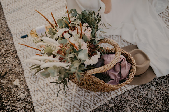 Hned mě napadlo, že by to chtělo něco jiného, když se chystáme do hor, a proto mě napadlo, že to pojmeme v boho stylu, který k té přírodě prostě bude sedět krásně. Jj, já a detaily, to mě prostě baví. A abych nebyla vyladěná jen já, vypůjčila jsem si v Nila Store nějaké krásné doplňky a dekorace pro něj i pro sebe. Parádní byl hlavně vlněný klobouk Yellow, který tomu dal ten správný boho šmrnc. Jeden z mála, co mi sedí velikostně v esku, dokonce slušel i jemu. Partner měl z Nily pásek, košile byla šitá na míru ke svatebnímu obleku z Oblack, kšandy jsem mu objednávala z Wow doplňků, protože jsem sháněla k bílé košili nějaké béžové s koženou vsadkou a tady měly jako jedni z mála super výběr. Motýlek jsem na poslední chvíli objevila v Zaře. Kalhoty a boty má již dlouho. Já jsem si z Nily ještě zapůjčila krásné sandálky od značky Laidback London, jediné, mohly by na noze více držet. A krásnou kytici na focení v boho stylu nám uvázaly v My Living My Garden, za což jim ještě jednou děkuji. Vydržela perfektní i po focení a měla jsem ji ve váze ještě týden.
