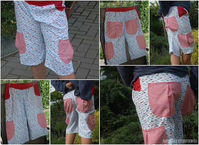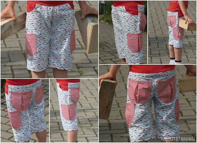 Nejprve bermudy s kapsami pro Jirku. Byla jsem ale moc rychlá a nastříhala si látku bez přídavků na švy a záložky… Každý tvůrce střihů to má jinak… (tyto jsem šila s „Caramilla„) Ještě že vynalezli šikmý proužek – pomohl mi u délek. A pokud jde o šířky – odšila jsem minimální přídavky na švy a ani Jirka nezklamal a do bermud vlezl se svou malou dupkou na pohodu i tak .-)