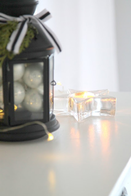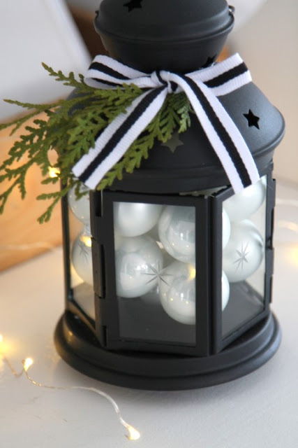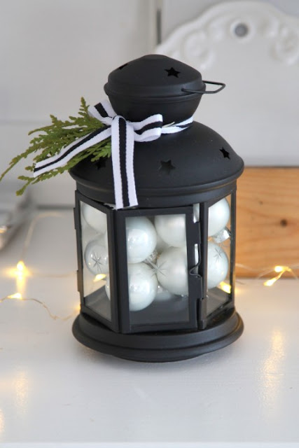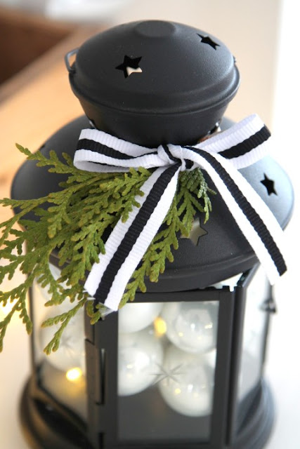 Svietnik z Ikey bol už dlhší čas nevyužitý a včera sa zo skrine dostal znovu von. Naplnila som ho guľkami Winter white, dozdobila halúzkami tuje a čiernobielou mašľou.