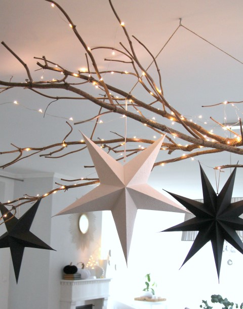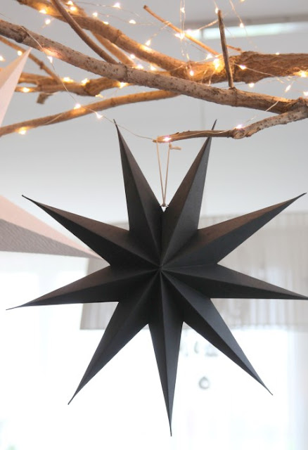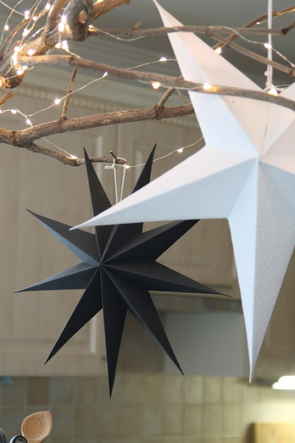 Môj obrovský konár nad kuchynským pultom zostáva aj tento rok. Zatiaľ som ho dozdobila papierovými hviezdami. Tie čierne sú z LALA design.