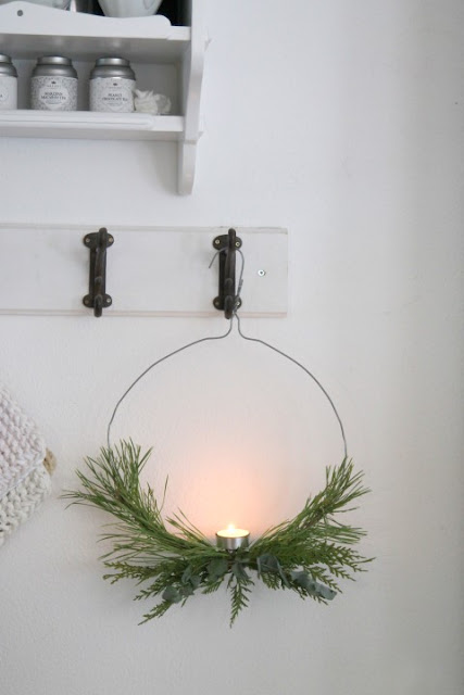 Z vešiaka z čistiarne som si spravila kruh, k tomu pár vetvičiek borovice, tuje a eucalyptusu, držiak na čajovú sviečku a dekorácia je hotová. Inšpirácia je z pinterestu a už dávno som si ho chcela urobiť.