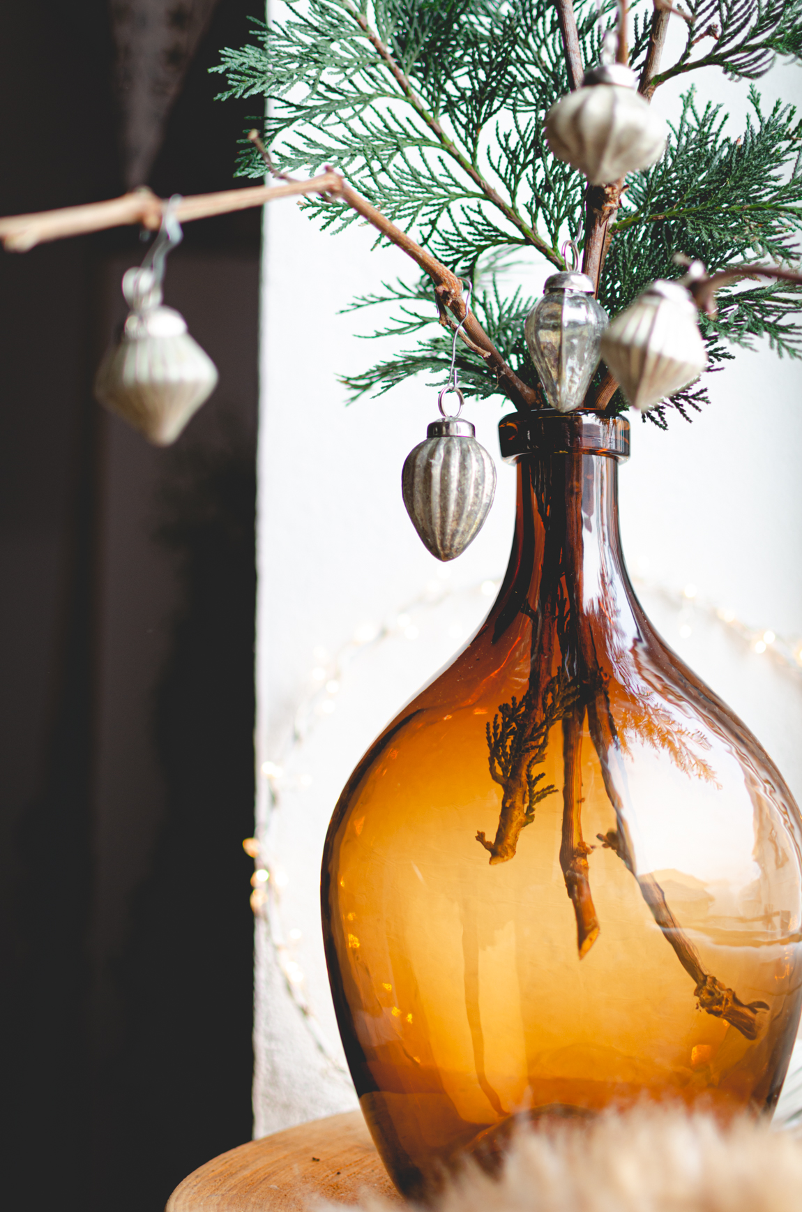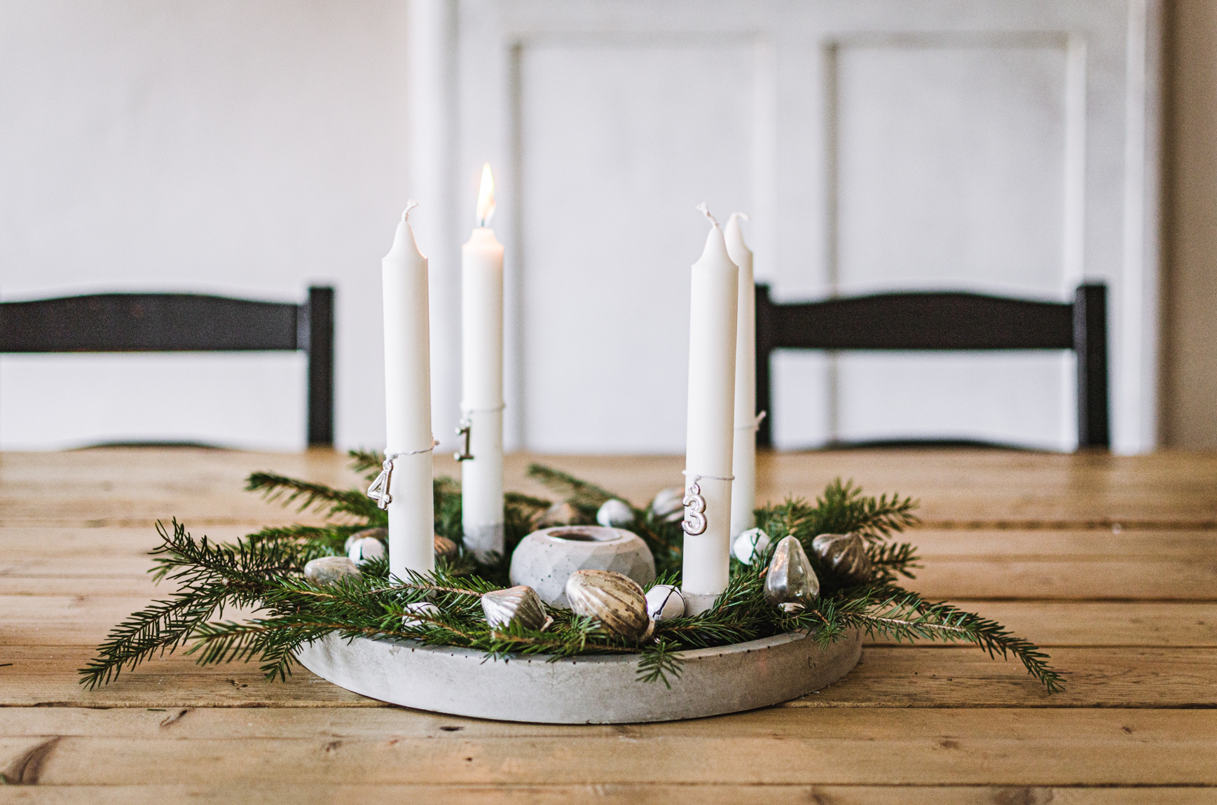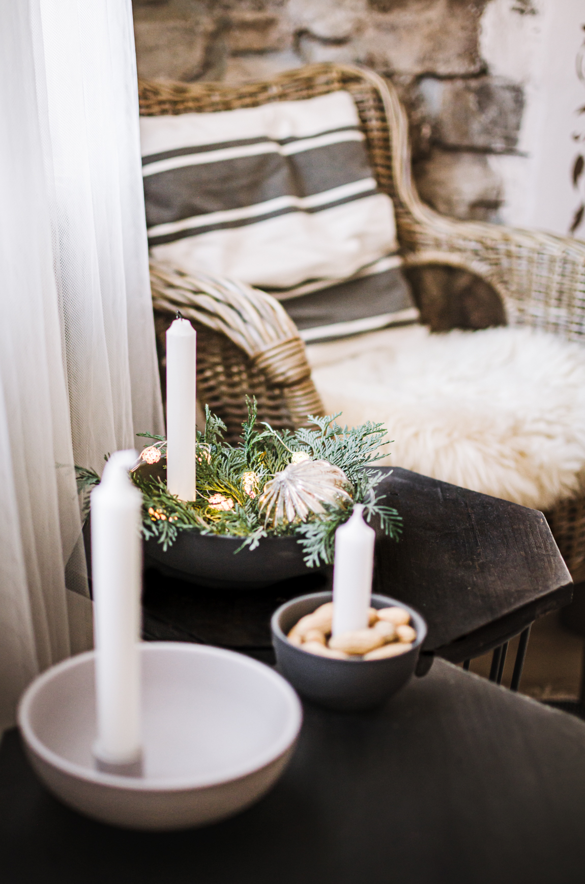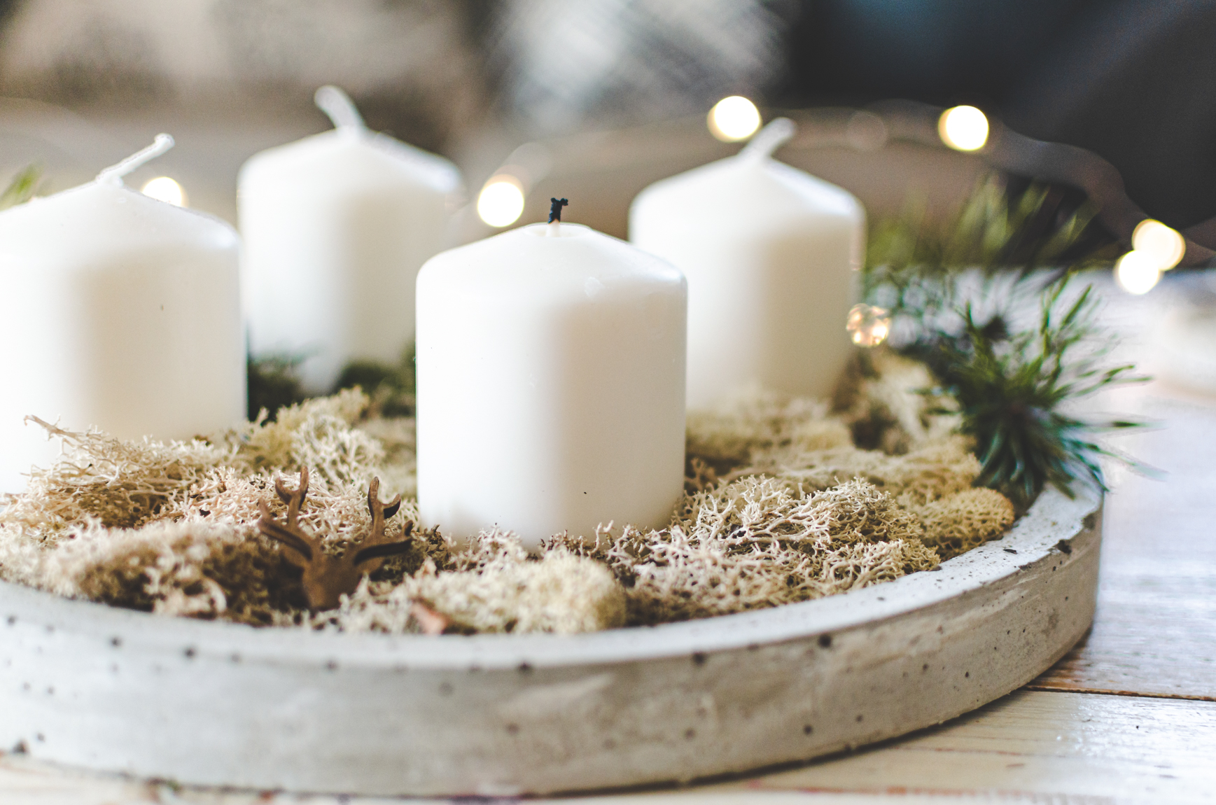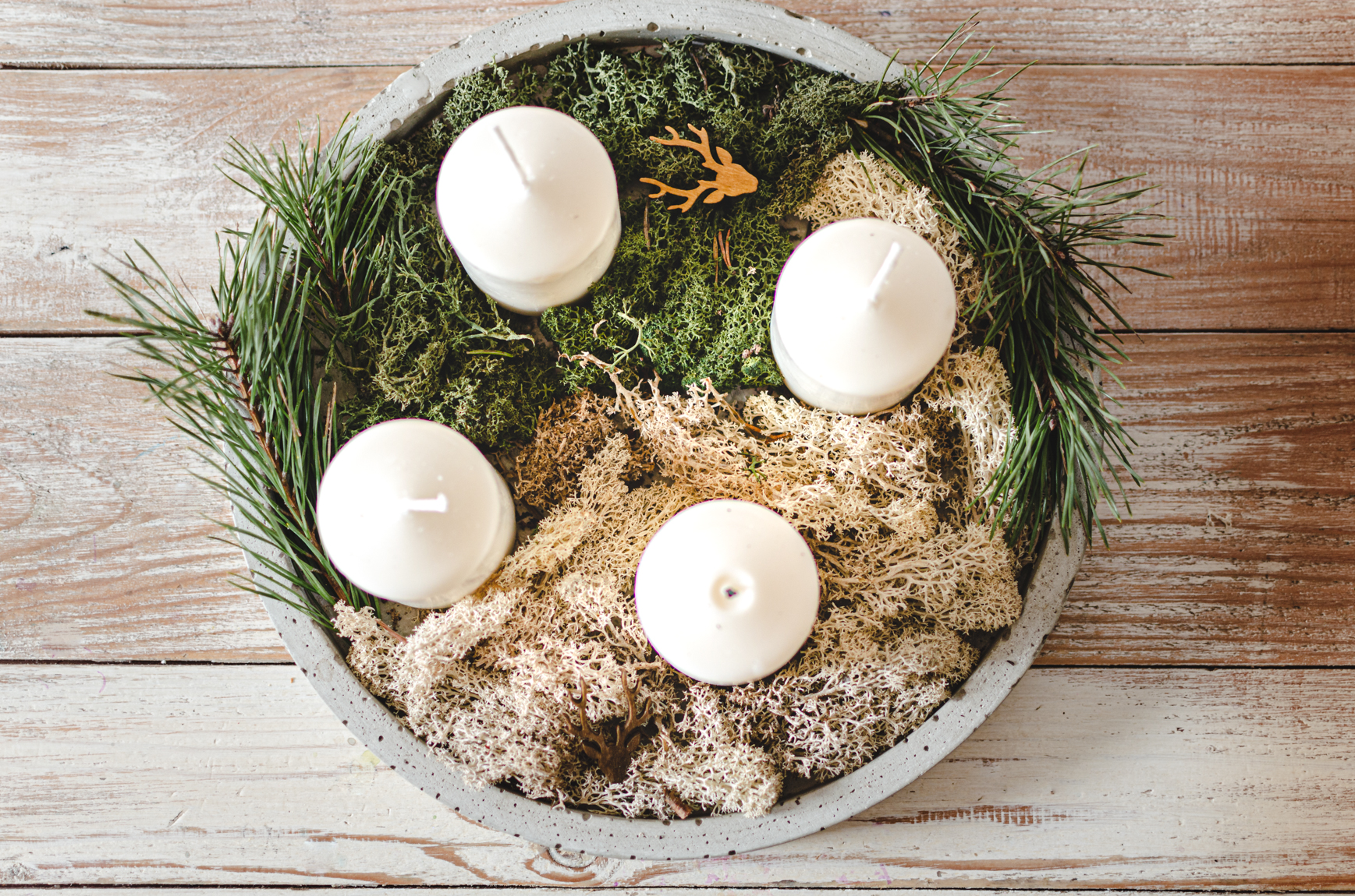 Oba svícny mají jako základ betonový podnos. Pak jen trochu ozdob, jehličí a irský mech. Je to velmi jednoduché, ale o to víc efektní. A pak ty větve, no. Minimálně v každé místnosti musí nějaká být, omotaná světelným řetězem. Když jsou tmavé dny, jako ten dnešní, krásně celý dům rozsvítí. A na jakou výzdobu jste letos vsadili vy?