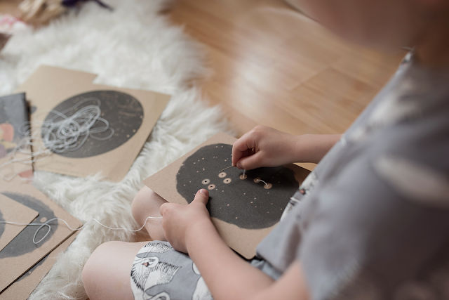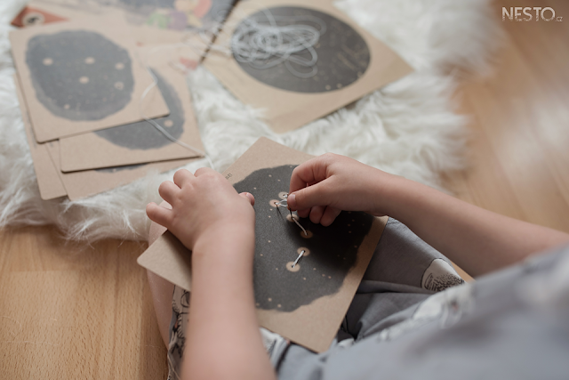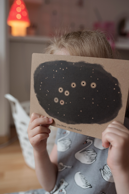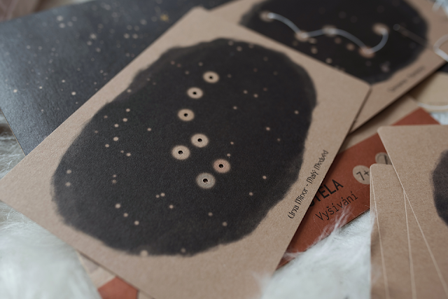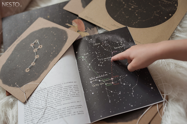 A tak nám přišel vhod Malý průvodce hvězdnou oblohou s fluorescentní nití. Slečna si souhvězdí sama vyšila a před spaním si je ukazujeme.