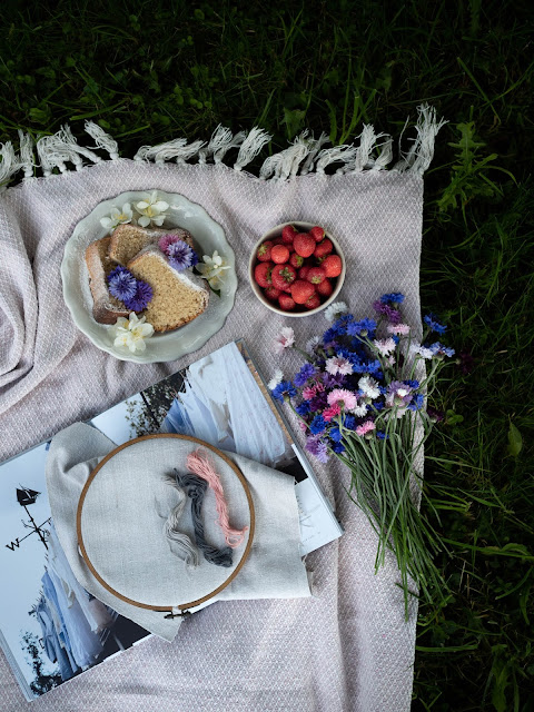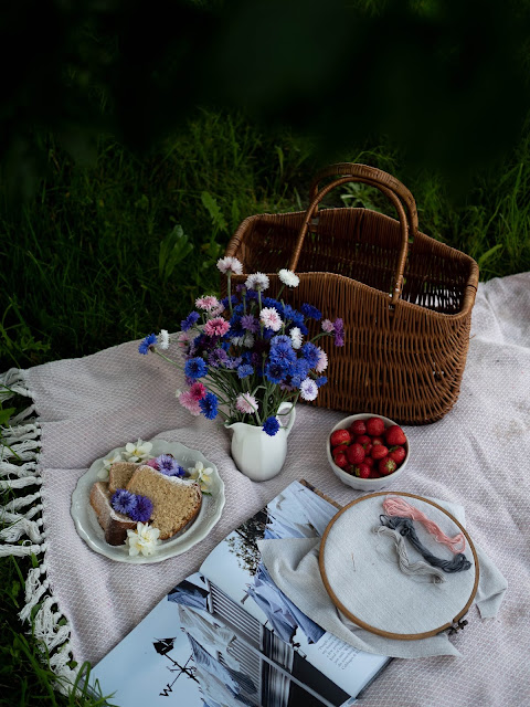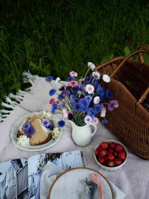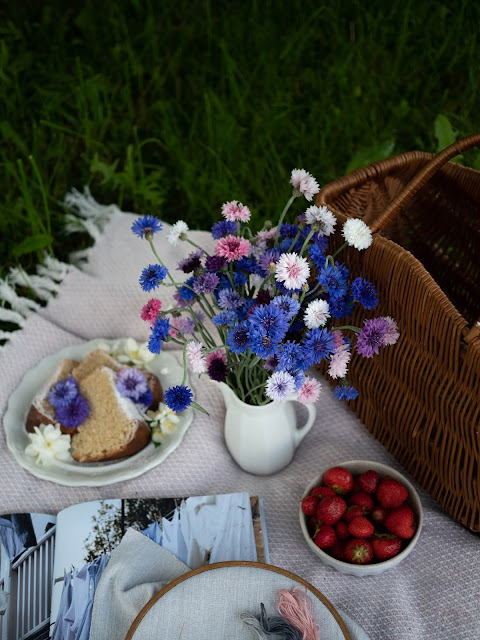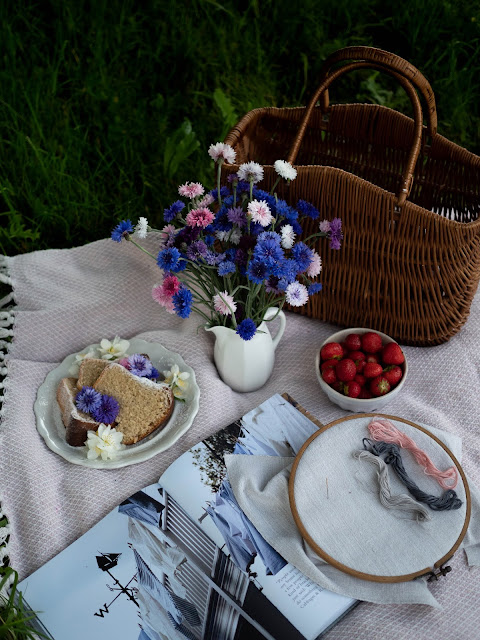 Po týždni si tu opäť ukladám nedeľnú spomienku. Dnes na prvé nevädze a malý piknik na záhrade. S Ninkou sme si chceli trochu posedieť, čítať, niekto aj vyšívať a vychutnávať nedeľné poklady ako čerstý koláč a jahody. Nakoniec som tento malý piknik iba odfotila a išli sme pekne na lavičku. Po dažďoch je zem stále vlhká. Teším sa už keď prídu ozajstné letné dni a my budeme sedieť pod stromom a pinikovať ♥