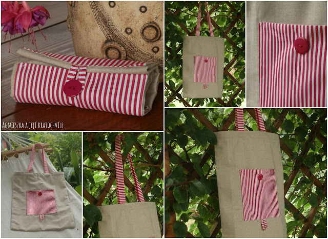 Jako základ je použita béžová bavlna s lněným efektem. „Šťávu“ dodávají tašce kapsa, poutko a ucha v proužkované červenobílé.