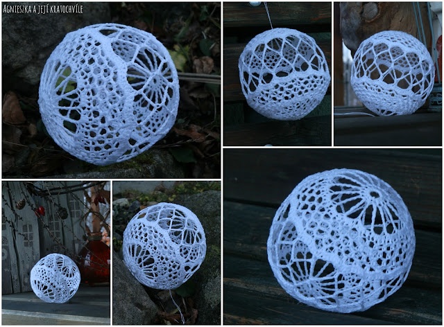 … která vzešla z mého háčku, byla slavnostně zavěšena na věnečky zavěšené nad jídelním stolem o druhé adventní neděli. Abych se nenudila, trochu mě pozlobila a já ji musela škrobit nadvakrát. Vytahuje se a škrobí na nafouknutém balónku, který se mi ovšem během noci vyfouknul… no a baňka tak nabrala tvarů, které nebyly z mé strany zrovna žádané.