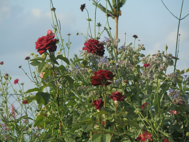 Brutnák lékařský vyplnil spolu s vysazenými trvalkami volná místa mezi růžemi, pletí se tak omezilo na minimum 🙂