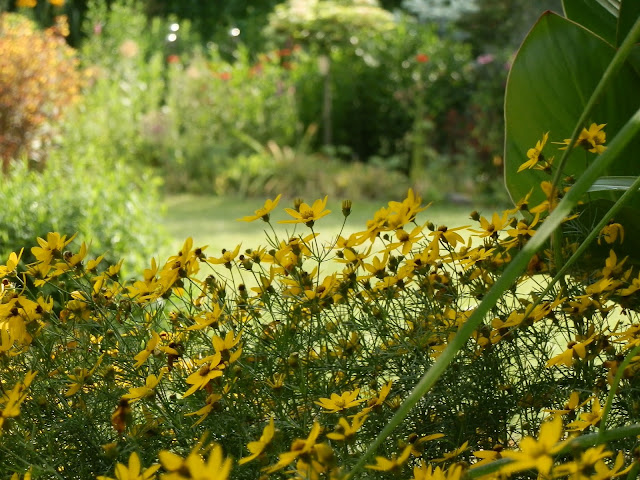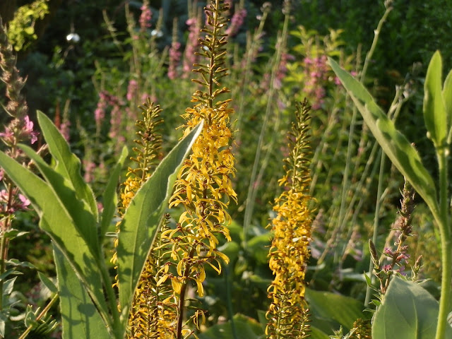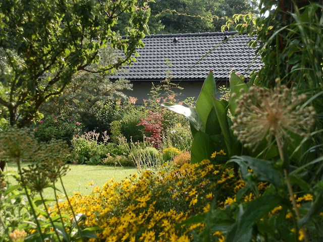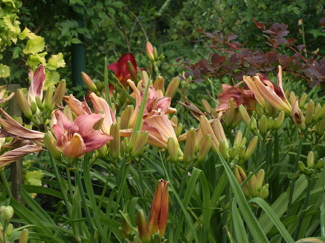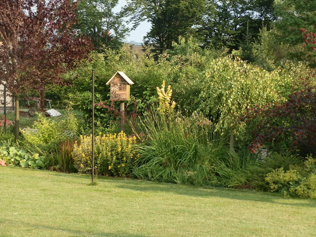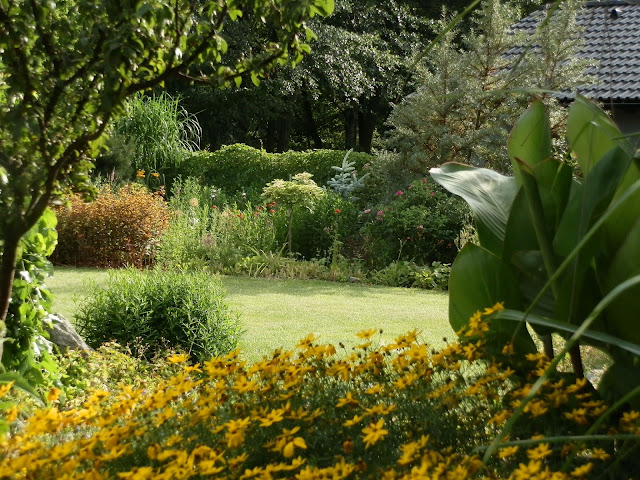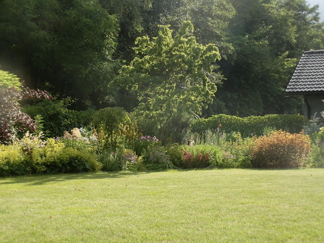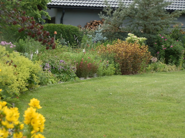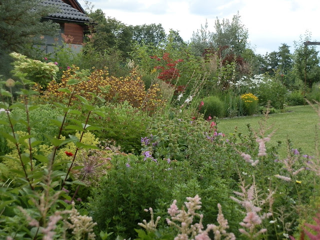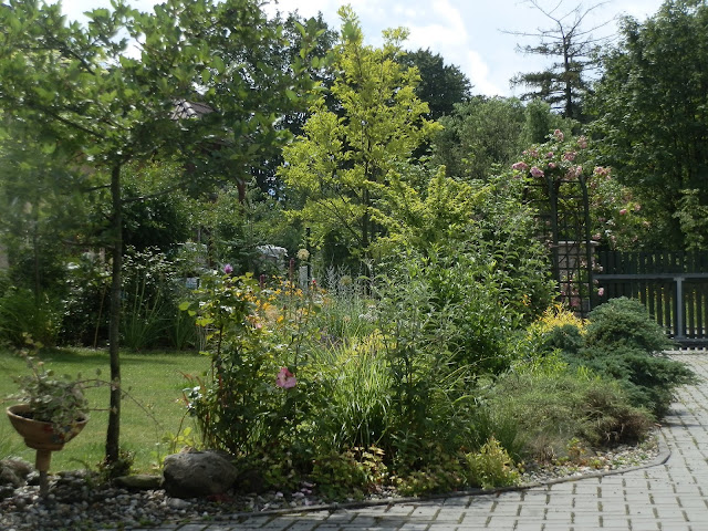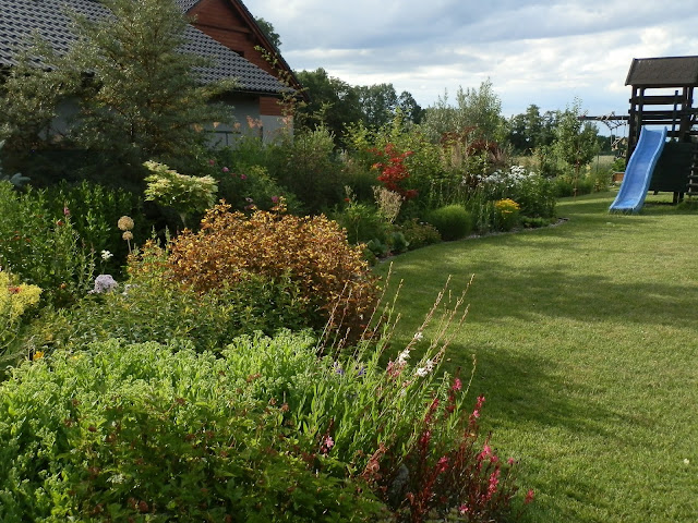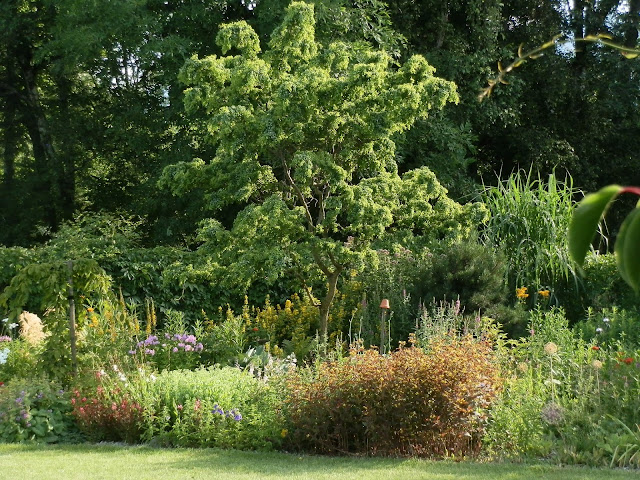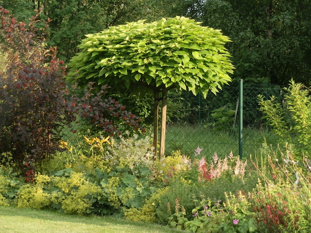 Vedle červenolisté tavoly kalinolisté „Diabolo“ se pomalu rozrůstá koruna katalpy trubačovité („Nana“). Žlutozeleně kvetoucí podrost jsem již zmiňovala (kontryhel měkký „Thriller“), za ním dál vykukují denivky či barevná květenství čechrav.