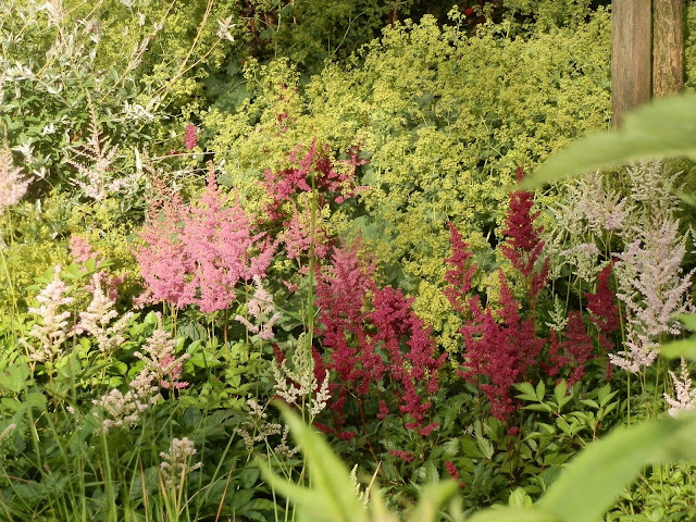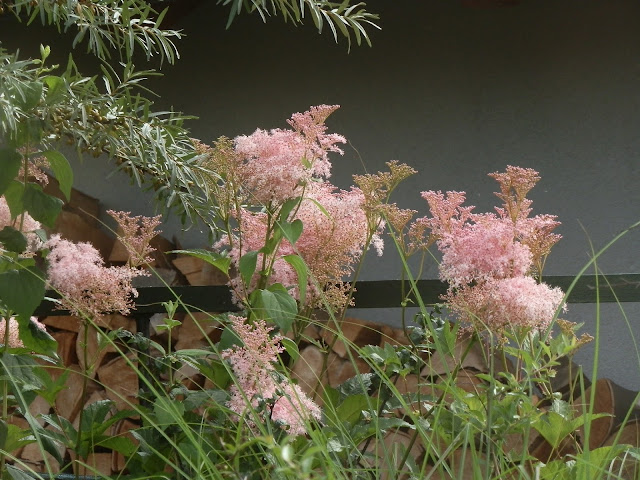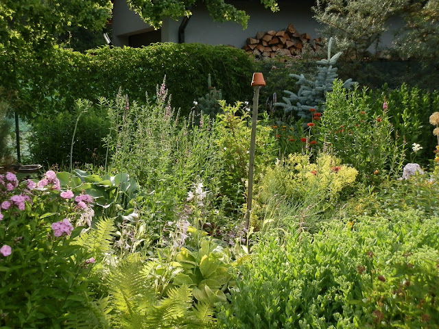 Zátiší pod akátem (Robinia pseudoacacia „Twisty Baby“) – světle růžově kvetoucí plaménka latnatá, světle fialové květy bohyšek, růžově nakvétající kyprej vrbice… doplňují kapradiny (pérovník pštrosí), nízký tužebník (Filipendula palmata „Kahome“) či rozchodníkovec nachový v předních partiích záhonu.