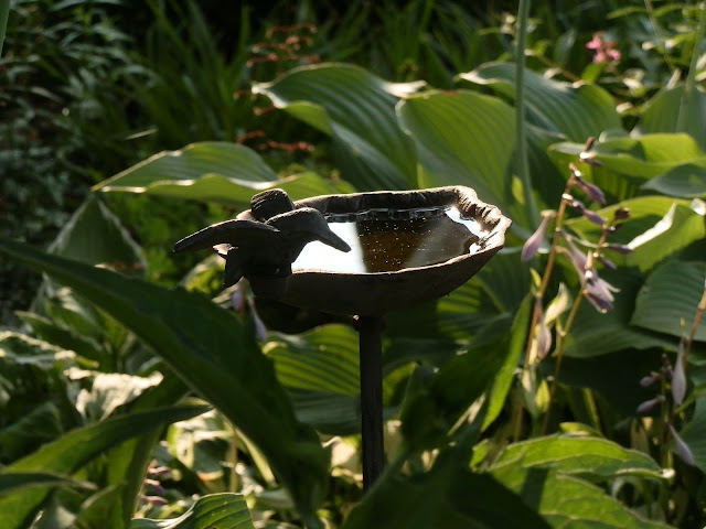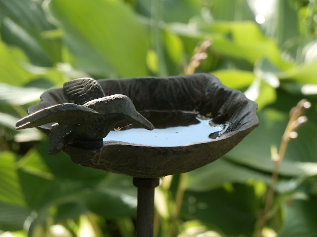 Litinové pítko pro ptáky v „zajetí“ bohyšek. Mám obrovskou radost, že se jim u nás začalo dařit. Nějakou dobu po založení zahrady jsme kvůli absenci starších stromů hodně bojovali s nedostatkem přistíněných míst.