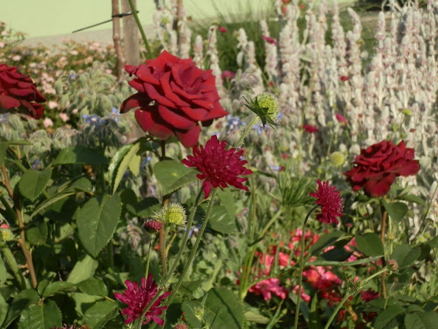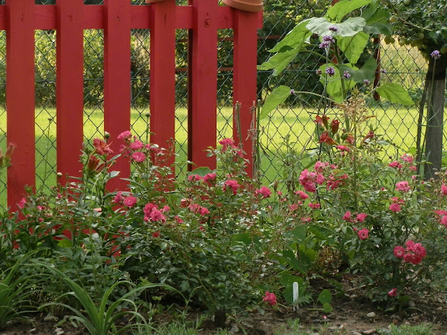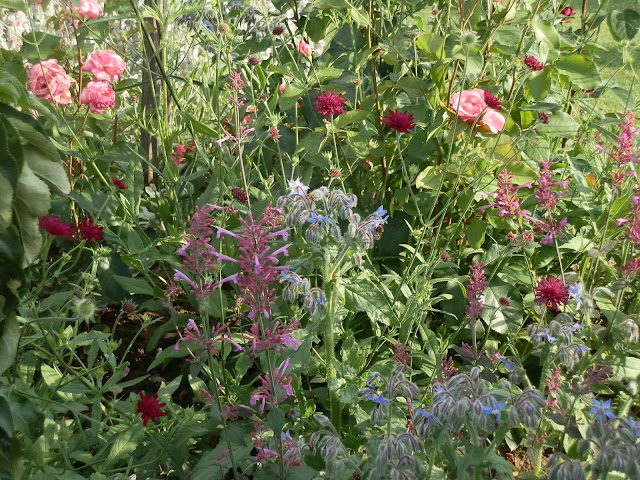 Další místečko, které získalo letos novou podobu – loni na něm naposledy stál dřevěný „jahodovník“, letos se proměnil v můj malý růžový kopeček. Krásu vysazených růží podtrhují další „jemné“ trvalky – kromě již dříve zmiňovaného sporýše argentinského také karmínové květy chrastavce makedonského (Knautia macedonica). Trochu neplánovaně, ale překvapivě příjemně se do celé kompozice zapojil i modrofialově kvetoucí brutnák lékařský. Letnička, ale bohatě se přesévající. Je jedlá a milují ji i včelky. V přední části také vykukují letos vysazené agastache s načervenalými listy („Bolero“).