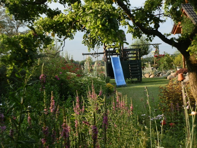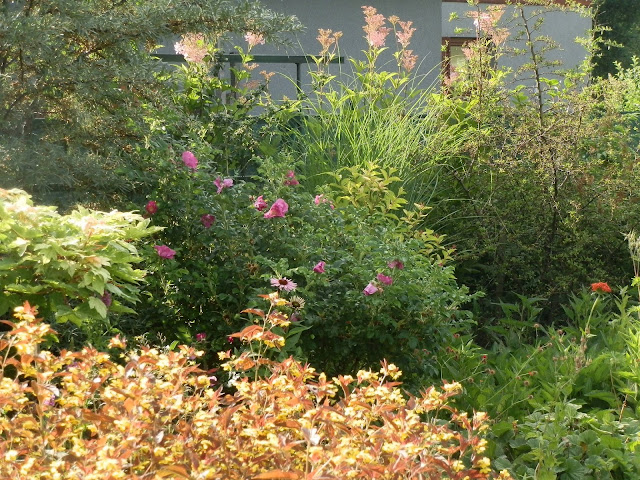 Tento výhled zaujme asi na první pohled červenolistou vrbinou (Lysimachia ciliata ‚Firecracker‘). Velký keř obalený v tuto chvíli žlutozelenými bobulemi je rakytník řešetlákový. Přes všechny počáteční obavy roste velmi dobře i na jílu 🙂 Vpravo od něj kvete růžově růže svraskalá. Ráda kombinuji v zahradě šlechtěné růže s těmi botanickými. Bývají velmi nenáročné a zdravé a navíc mají nádherné šípky – které lze využít v kuchyni i jako skvělý dekorační materiál .-)