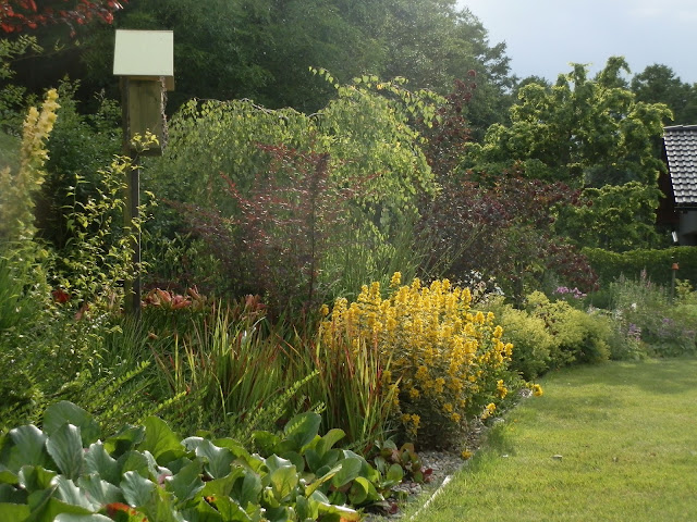 Akát ještě jednou s větším odstupem (Robinia pseudoacacia „Twisty Baby“). Kromě již dříve jmenovaných rostlin i červenolistá vrbina tečkovaná s jednoduchými žlutými květy (Lysimachia ciliata ‚Fiecracker‘. Známější zelenolistou vrbinu je možno vidět v zadní partii záhonu, její květy jsou také žluté, ale výraznější.