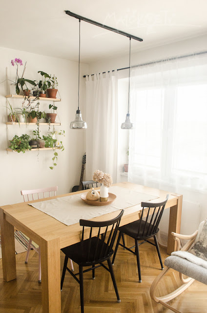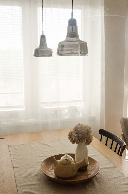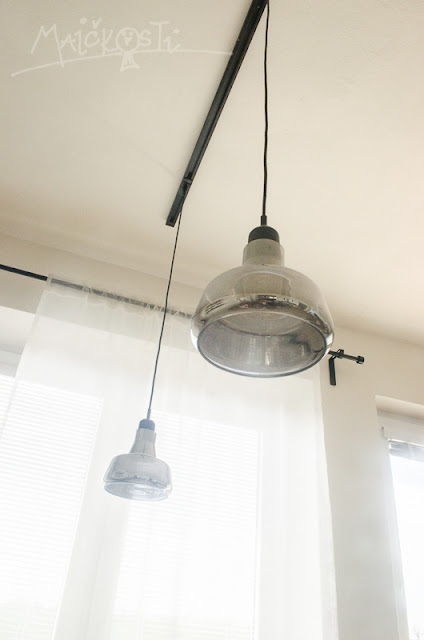 ... a to ještě pořád není všechno! Takže jsem se tedy zamilovala podruhé a úplně jinak. Z mé původní představy, že závěsná světla nad jídelním stolem budou dva měděné "trichtýře" brzy sešlo poté, co jsem tak nějak omylem objevila nádheru z kouřového skla ne zcela nepodobnou ikonickému kousku od Brokisu, ovšem za cenu asi tak čtvrtinovou. Vlastně to do sebe najednou všechno zapadlo. Pořád jsem si totiž nebyla jistá, jestli mě ta měď nepustí, jestli to není momentální módní výkřik. A jestli jsem schopná v této měděné tendenci pokračovat na více úrovních. Oproti tomu sklo je věčné, sklo je nadčasové a ten tvar! Nechala jsem to nějakou dobu dozrát. Jako ostatně všechno u nás doma. Zařizovat pro sebe, to je kříž! V mé složce s názvem "osvětlení" jsem nashromáždila několik adeptů. No ale srdcem jsem to měla už stejně jasně rozhodnuté. Nakonec jsem tedy objednala. Bylo to před Vánoci. Takový náš dárek k Ježíšku. Těšila jsem se jak malá. Pak dorazily. A přišlo trochu zklamání. Nějak jsem nepočítala, že kouřový povrch bude působit až tak hodně dojmem zrcadla. Zhluboka jsem dýchala a přemýšlela, co s tím. Takže zase pár dní a nocí. Nevypadalo to blbě. Potíž byla, že jsem produktové fotky blbě vyhodnotila a něco si v hlavě vykonstruovala, no a to, co přišlo, pak vypadalo prostě jinak. Takže, jak vidíte, ani láska na první pohled nakonec nemusí být tak jednoznačná ve chvíli, kdy dojde k pohledu druhému. Pokud to ale má vydržet, tak to vydrží. A tak i já jsem po chvilce váhání nakonec udělila svítidlu šanci a dneska jsem za to fakt ráda, protože mám dojem, že moje láska sílí. Jsou dvě. Chodím okolo nich s úctou a respektem (neb jsou skleněná) a obdivně na ně pohlížím, těším se z jejich přítomnosti. Kdyby vás zajímalo, co jsou zač, tak se jmenují Chrystie, jsou od Nordluxu a prodává je Severské světlo. Jsem si jistá, že kdybych k nim postavila "originál" od Brokisu, bude to jako když v druhé třídě měla jedna spolužačka Barbínu od Matella, kdežto my ostatní laciné imitace z polského "targoviska". Detaily prostě nejsou tak dokonale zpracované. Ale dvacet tisíc na dva lustry jsem prostě neměla, a tak jsem s těmito víc než v pohodě :-D