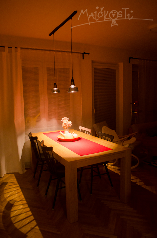 ... a to ještě pořád není všechno! Takže jsem se tedy zamilovala podruhé a úplně jinak. Z mé původní představy, že závěsná světla nad jídelním stolem budou dva měděné "trichtýře" brzy sešlo poté, co jsem tak nějak omylem objevila nádheru z kouřového skla ne zcela nepodobnou ikonickému kousku od Brokisu, ovšem za cenu asi tak čtvrtinovou. Vlastně to do sebe najednou všechno zapadlo. Pořád jsem si totiž nebyla jistá, jestli mě ta měď nepustí, jestli to není momentální módní výkřik. A jestli jsem schopná v této měděné tendenci pokračovat na více úrovních. Oproti tomu sklo je věčné, sklo je nadčasové a ten tvar! Nechala jsem to nějakou dobu dozrát. Jako ostatně všechno u nás doma. Zařizovat pro sebe, to je kříž! V mé složce s názvem "osvětlení" jsem nashromáždila několik adeptů. No ale srdcem jsem to měla už stejně jasně rozhodnuté. Nakonec jsem tedy objednala. Bylo to před Vánoci. Takový náš dárek k Ježíšku. Těšila jsem se jak malá. Pak dorazily. A přišlo trochu zklamání. Nějak jsem nepočítala, že kouřový povrch bude působit až tak hodně dojmem zrcadla. Zhluboka jsem dýchala a přemýšlela, co s tím. Takže zase pár dní a nocí. Nevypadalo to blbě. Potíž byla, že jsem produktové fotky blbě vyhodnotila a něco si v hlavě vykonstruovala, no a to, co přišlo, pak vypadalo prostě jinak. Takže, jak vidíte, ani láska na první pohled nakonec nemusí být tak jednoznačná ve chvíli, kdy dojde k pohledu druhému. Pokud to ale má vydržet, tak to vydrží. A tak i já jsem po chvilce váhání nakonec udělila svítidlu šanci a dneska jsem za to fakt ráda, protože mám dojem, že moje láska sílí. Jsou dvě. Chodím okolo nich s úctou a respektem (neb jsou skleněná) a obdivně na ně pohlížím, těším se z jejich přítomnosti. Kdyby vás zajímalo, co jsou zač, tak se jmenují Chrystie, jsou od Nordluxu a prodává je Severské světlo. Jsem si jistá, že kdybych k nim postavila "originál" od Brokisu, bude to jako když v druhé třídě měla jedna spolužačka Barbínu od Matella, kdežto my ostatní laciné imitace z polského "targoviska". Detaily prostě nejsou tak dokonale zpracované. Ale dvacet tisíc na dva lustry jsem prostě neměla, a tak jsem s těmito víc než v pohodě :-D