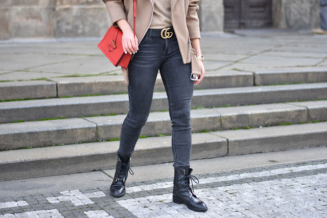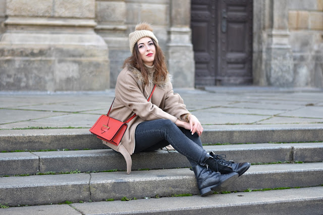 Vemte si takový obyčejný outfit jako je béžový kabátek, černé džíny a přidejte k tomu výrazný červený detail. Hned z toho máte něco mnohem zajímavějšího. Vždycky jsem z červené měla respekt. Obdivovala jsem sice rudé kabáty až na zem, velkou večerní v královsky červené, ale nikdy jsem na tyhle kousky neměla odvahu. A to i přesto, že tahle super barva sluší blondýnám i brunetkám. T|roufla jsem si tedy alespoň na rtěnku, protože svůj perfektní červený odstín máme každá. A taky na tuhle boží kabelku z Camelia Roma. Mají super stylové kousky většinou z kůže. Už dlouho jsem chtěla mít v šatníku něco výraznějšího a tahle kabelka perfektně splnila účel. Díky ní dokážu rozsvítit jinak nudný outfit v mých oblíbených barvách šedé, béžové a černé. Co myslíte, byla by snad k tomuhle outfitu lepší barva?