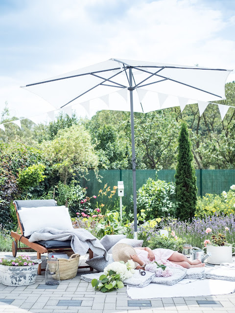 Terasa je veľmi veľká, z časti prekrytá. Väčšia časť je však pod holým nebom a tým pádom aj na slnku, ktoré za dom zachádza po 16tej hodine. Kombinácia zámkovej dlažby a slnka nie je žiadna sranda, hlavne, keď na blízku nie sú veľké stromy. Od začiatku, ako sme terasu pred pár rokmi vytvorili som túžila po slnečníku. Nevedela som sa však rozhodnúť, aký štýl zvoliť. Všetky mi prišli príliš „moderné“ a nezapadali do môjho štýlu. Slnečník od Jysk je však štýlovo niekde medzi – hodí sa tak do vidieckej záhrady a je hlavne bielej farby. Áno, neodolala som ♥ Podstavec tiež spĺňa moje nároky, pretože má vzhľad kameňa.