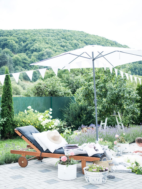 Musím priznať, že slnečník nesplnil iba praktickú stránku, ale aj estetickú. Veľkú plochu terasy, ktorá je o niečo vyššie, ako záhrada a trávnik rozbil. Myslím, tým fakt, že sa už viac necítite, ako na pódiu 🙂 Aby som ten otvorený priestor ešte viac rozbila, vyrobila som biele vlajky, celkom v štýle anglickej záhrady…