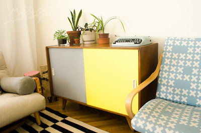 Nejprve ale bylo třeba povrch zatmelit – tedy v místech, kde jsem špachtlí hrábla trochu víc – a přebrousit. Toto jsem opakovala několikrát. Pak teprve přišla na řadu barva. Chvilku jsem váhala. Zůstat u šedé? Bílou a černou jsem zavrhla vzhledem k barvě samotné skříňky a stěny za ní. Nebo že bych zkusila nějakou retro pastelku? Dva dny mi to uzrávalo v hlavě a nakonec to dopadlo na kombinaci světle žluté a šedivé. V hlavní roli opět starý známý Balakryl. Miluju ho! Mám doma pár plechovek a vzájemným mícháním si dělám vlastní požadované odstíny. Tentokrát jsem do původní kanárkové žluti nalila hooodně bílé a dosáhla tak příjemného retro odstínu. Šedou jsem tvořila z černé a bílé, zkoušela a zkoušela tak dlouho, až to bylo ono. No a tady je výsledek 🙂 Skříňka už se u nás zabydlela. Hned jsem ji zkamarádila se starým psacím strojem, který má úžasnou ledově modrou barvu, a hromadou kytek, protože to je teď aktuálně moje velké téma: udělat si to doma zelenější.