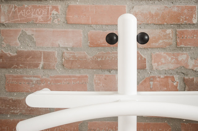 V nezměněné podobě přetrval dlouhé roky, pak ho měla na bytě moje ségra a teď se znovu vrátil ke mně. Chyběla mu jedna koulička, podnoží se kymácelo a lak už byl na ostudu. Ale jinak žádné velké defekty nevykazoval. Nic, co by se nedalo opravit. A tak ho manžel dole trochu utáhnul, já ho přebrousila a prasklinku na věšákové části zatmelila, kouličky jsme mu dali nové - použili jsme komponenty z dětské skládačky (promiň, Madli!), a nakonec přišel nátěr. Nad barevností jsem opět chvíli musela dumat, ale... tak schválně, co při vyslovení slova Sluha napadne vás? Já si vzpomněla na Saturnina. A nápad byl na světě! Náš sluha dostal vyloženě služebnický mundur.