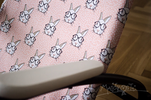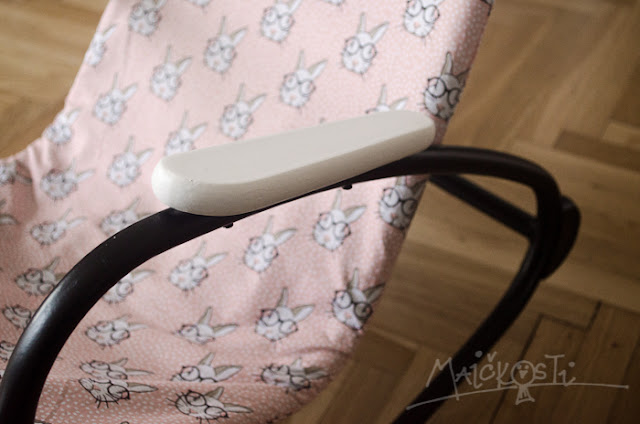 Co dlouho nebylo dořešené, byl potah. Tušila jsem, že půjdu do pudrové, která se v pokojíčku opakuje na různých detailech. Králíci byli také celkem jasní, protože je má Madla ráda. Ovšem favoritů bylo několik, cena na mých oblíbených látko-webech celkem vysoká a pořád jsem neměla sílu to rozseknout. Až jsem jednou náhodou na úplně jiných stránkách a při naprosto jiném úkolu objevila tyto obrýlence za cenu víc než příznivou. A tak bylo rozhodnuto. Křeslo jsem potáhla za 55 korun a ještě mi polovina látky zbyla na jiný projekt (že by holčičí šatky? ;-)). No a takto to dopadlo: