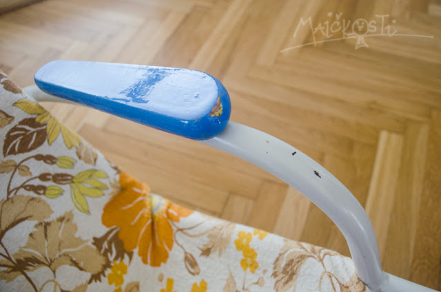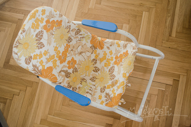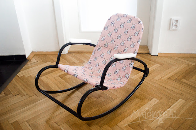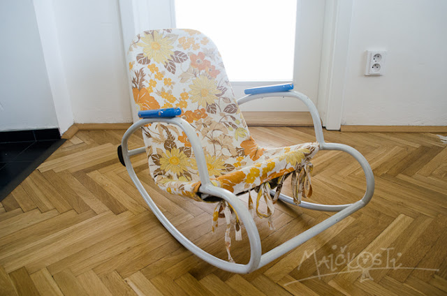 Mohlo by se zdát, že všechny moje kanály pomalu odumírají. No, abych byla upřímná, skoro se stalo. Letos jsem se ocitla v nějakém začarovaném kruhu a času se mi začalo kriticky nedostávat. Hodně to souviselo s mojí prací - s tím, jak Madla roste (a výše rodičáku se povážlivě úží), jí prostě přibývá. Všechno to vyvrcholilo na podzim, kdy jsem zoufale doháněla resty vzniklé rozvolněným prázdninovým režimem a do toho se přidaly zdravotní potíže. Dostala jsem se do zlomového bodu, stejně jako spousta bloggerů, a uvažovala jsem, jestli v publikování vůbec pokračovat. Začalo mi to připadat úplně zbytečné a nedůležité. A tak jsem to prostě dala k ledu. Až po několika měsících absence na síti jsem si uvědomila, že mi to vlastně dělá radost. Že to je moje forma komunikace. A v tomto podivném bezčasí na mateřské, kdy se člověk ráno probudí do zaneřáděného bytu, přes den ho pětkrát uklidí, pětkrát navaří a večer je všude úplně stejný nepořádek a nikde žádný hmatatelný výsledek čehokoli, je přesně TOHLE ten můj malý hmatatelný výsledek. A tak jsem procitla z těžkého snu. Pomalu se z toho hrabu a doufám, že se blíží konec toho tmavého tunelu. Takže co se blogu týče, neříkejme tomu smrt, spíš hibernace. Pro ty, kdo sem občas zaskočí, bych ráda slíbila zase jakousi pravidelnost. Ovšem frekvence bude asi o něco nižší, než jste byli zvyklí. Nápady mi nedošly. Některé jsem v létě stihla i zrealizovat. Dát k nim dohromady články je ale pro mě obtížné. Všechno nafotit ještě obtížnější. Dneska tedy po dlouhé době první příspěvek. Ukážu vám, co jsem naposledy spáchala v oblasti renovací. Je to opět takový miniprojekt, ale i tak mi zabral spoustu času, slepovala jsem ho doslova z jednotlivých volných minut. Jedná se o dětské houpací křesílko, které všechny předrevoluční děti pamatují z mateřinek a někteří z vás ho možná měli i doma...