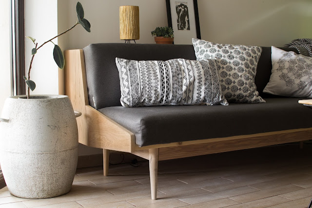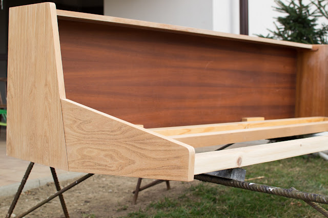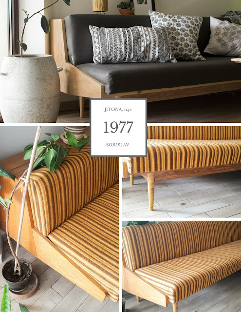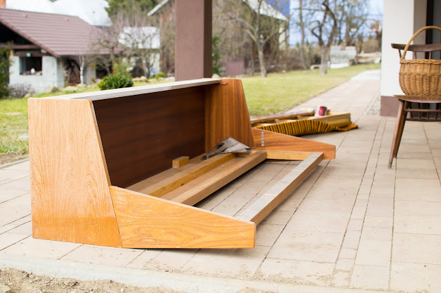 Pohovku som vyhliadla na bazoši spolu s kreslami. Viac ako rok čakala na svoju premenu. Dlho som zháňala látku na čalúnenie a aj rozhodnutie svetla, tmavá nebolo jednoduché. V čom som mala ale jasno, bolo ako prerobím drevo a dyhu ( odstránenie laku a ponechanie prírodnej farby).