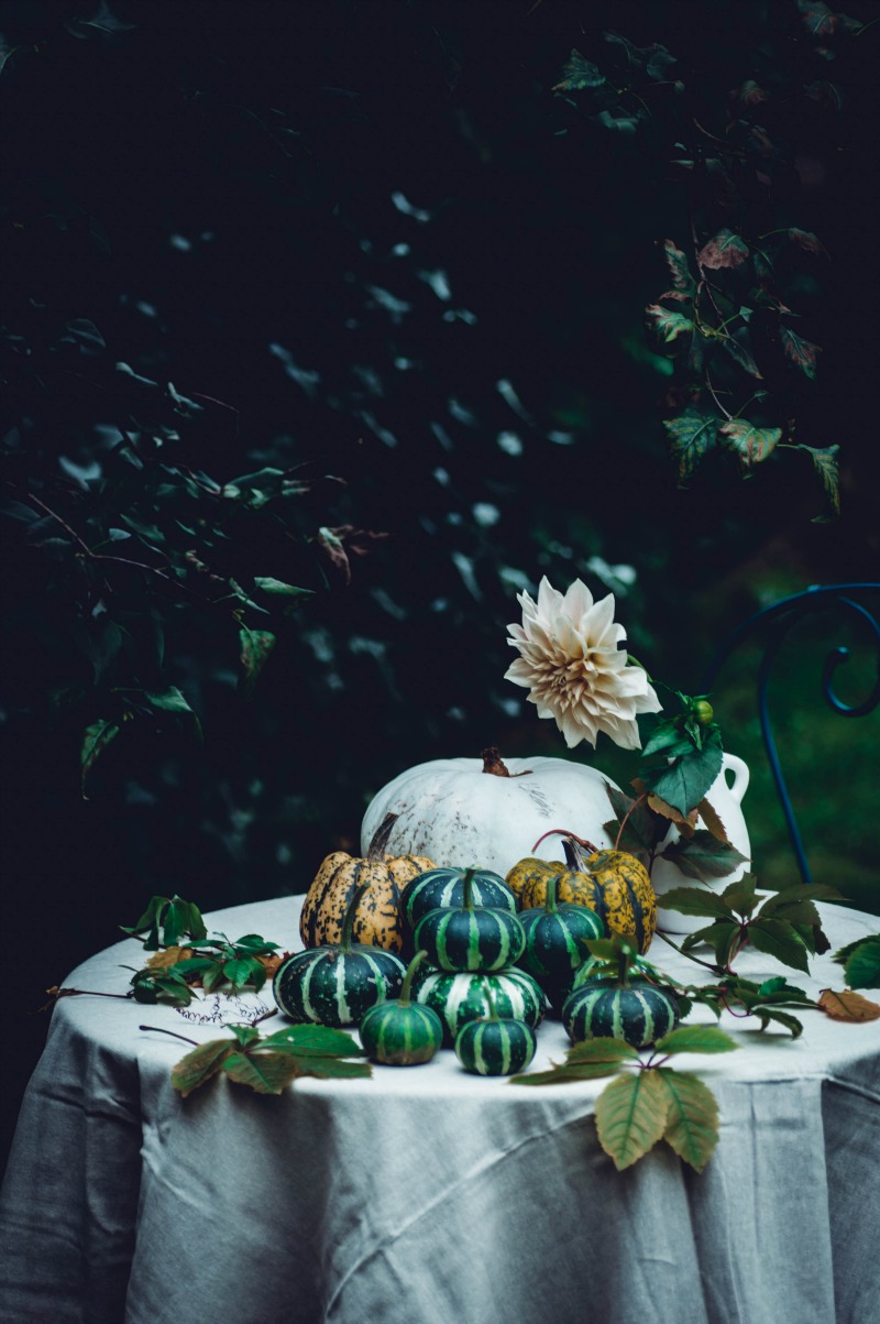 Na ozdobu stolu mi stačilo pár okrasných dýní, listů psího vína a jiřiny.