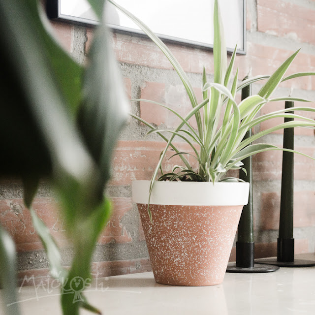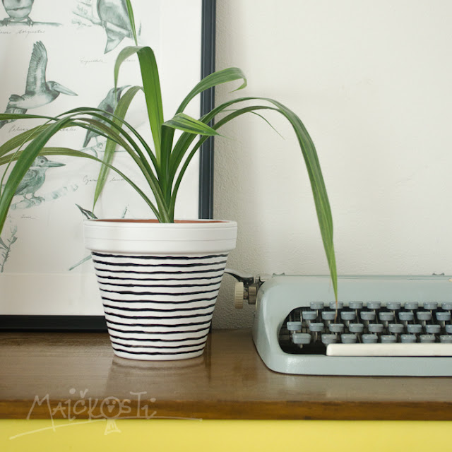 U nás to vzniklo vlastně trochu spontánně: líbí se mi bílo/černo/vzorované květináče, ale buď jsou příliš drahé, nebo jsem zkrátka nemohla nikde sehnat přesně to, co jsem si představovala. Ale mám doma Balakryl a ten řeší všechny mé životní problémy! A tak jsem prostě nakoupila pár nejobyčejnějších terakotových květináčů a rozhodla se je v Madlenčině spací pauze proměnit. Dcera se nakonec vzbudila neočekávaně dříve a když viděla moji improvizovanou dílničku na jídelním stole, hned ji to zaujalo. A tak dostala do ruky štětec, zbrusu nový květník a několik jednoduchých instrukcí. A začala tvořit. S opravdovým nadšením! Tvořily jsme obě dvě, v tichosti, spolu, ale každá zvlášť. Její dílko mě ohromilo! Na této technice je skvělé, že ať to vezmete za jakýkoli konec, výsledek je většinou až překvapivě povedený!