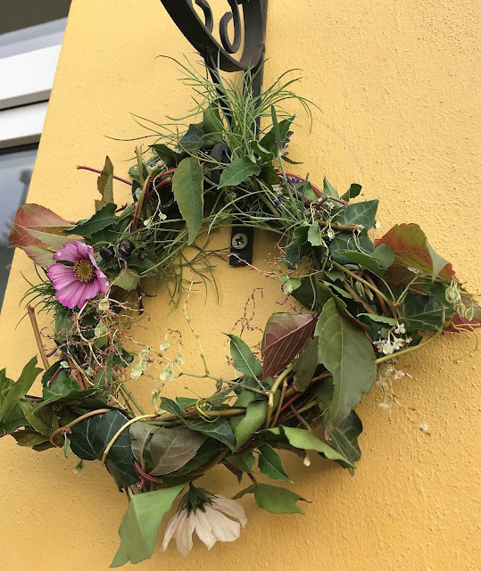 Vyšla jsem si dnes, stejně jako každý den, na odpolední procházku se psíky. Za domem máme takovou dlouhou a úzkou uličku. Naprosto pozitivní místo na světě. Ulička je 4m široká a pár set metrů dlouhá. Ústí do ní zadní branky od zahrádek a psi do ní chodí na... Ulička si celoročně žije svým vlastním způsobem života. Je chráněná před silnými větry, žijí tady brouci a motýli, po plotech zde šplhají popínavé rostliny, psí vína a vinné keře. A právě šlahouny opletky Aubertovy, náprstníku, přísavníku tříprstého a břečťanu tvoří základ tohoto věnečku, který jsem uvila v pátek vlastně za pár minut...
