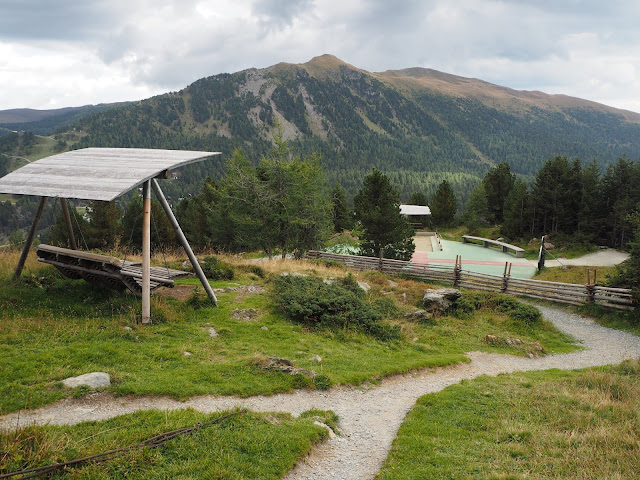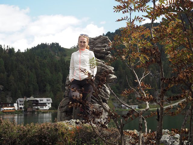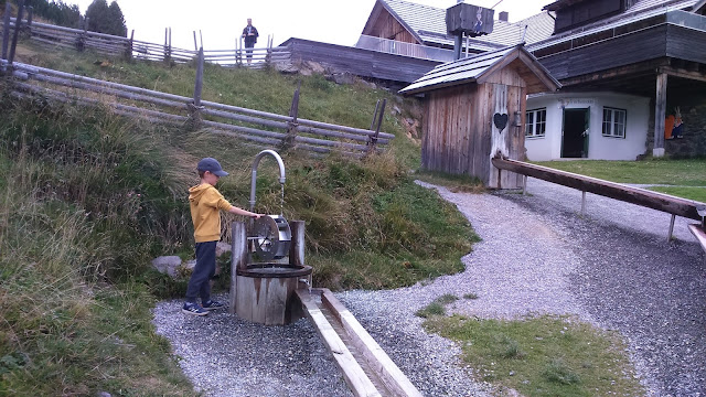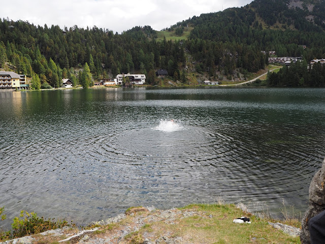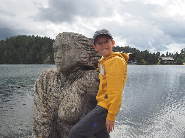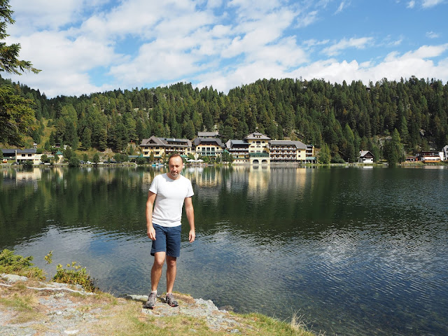 další den jsme vyjeli hned po snídani a tím pádem jsme stihli vidět spoustu krásných míst. Jedním z nich bylo Turracher Höhe. Začali jsme, jak je u nás zvykem koupáním v jezeře. Bertík k mé radosti do vody jít nechtěl ...