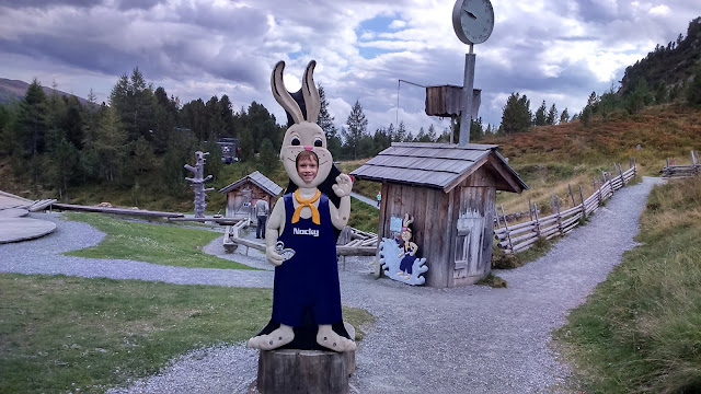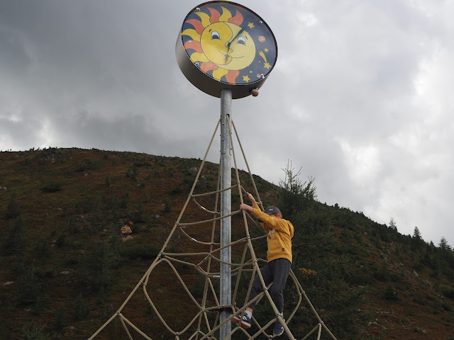 ... jenomže má takový zlozvyk. Kdekoli a kdykoli vylézt na cokoliv. I v Salzburgu vylezl v místním udržovaném parku soše málem na hlavu. Tam jsem ho ale stihla včas zarazit, tady ne :-(. Naštěstí bylo nedaleko dětské hřiště a to nás zachránilo ...