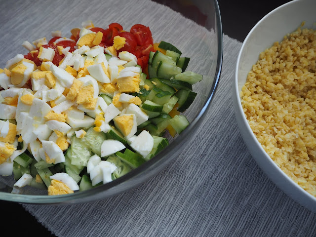 Bulgur jsem připravila podle návodu. Ostatní nakrájet, smíchat, ochutit solí, případně pepřem a je hotovo 😉 …