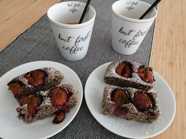 Přimíchat, vylít do pekáčku (ideál jako na buchty, 37×24 nebo tak něco) nebo koláčové formy (ta moje je trochu malá, 25cm, tak je to dnes spíš makovec), poklást hustě švestkami a pocukrovat dalším cukrem (taky hnědým krystal) – na švestkách udělá sirup, na těstu křupavost. Péct cca 30 min na 180 a běžet!