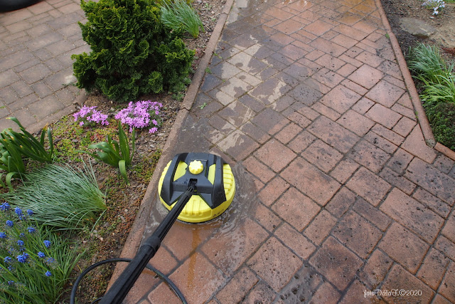 Vyčištěnou, ale stále špinavou dlažbu jsme museli ještě ostříkat vodou,