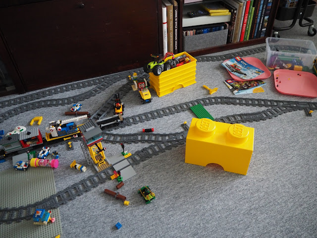 ... Adámek prohlíží jeden z lego dárků. Těch bylo více, kromě sněhové rolby↓↓ a výhybek ke kolejím ...