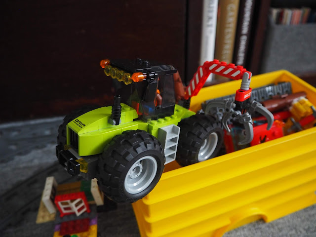 ... ještě lesní stroj na převoz klád. Dostal i jeden nelego dárek - puzzle s McQueenem. Od rodičů zatím lego box, v plánu máme kolo ...