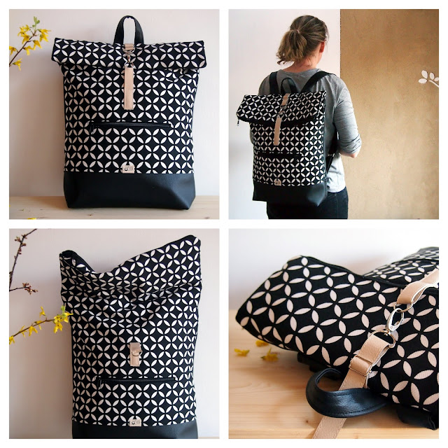 Z látky šiji celý vrchní díl (z koženky zůstává oboustranně dno a záda) - připadá mi tak batoh takový čistší..