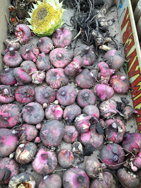 Sklizeň hlíz by měla probíhat v době, kdy je půda suchá, což s ohledem na letošní počasí je trochu těžké, protože je mokro… Rycími vidlemi nebo rýčem vyryjeme celou rostlinu, z hlízy oklepeme hlínu, stvol odstřihneme a hlízu necháme zaschnout. Po zaschnutí vidíme, že na staré scvrklé hlíze se nachází hlíza nová, často jsou kolem ní ještě malé kuličky (brut), které nevyhazuji, ale také je zasadím do každoroční gladiolové školky. Novou hlízu oddělíme od staré, dočistíme ji, a poté uskladníme v místě, kde nám v zimě nepromrzne. Starou hlízu vyhodíme do bioodpadu, ale nikoliv do našeho kompostu.