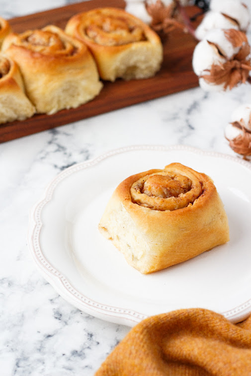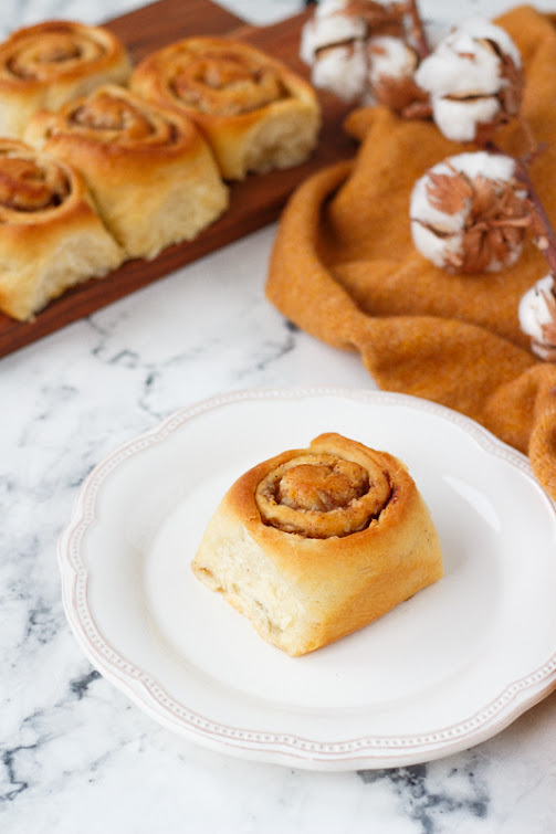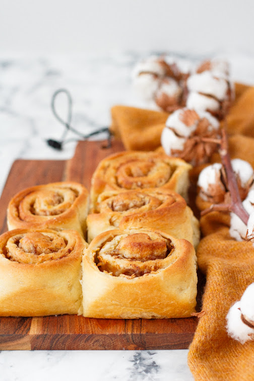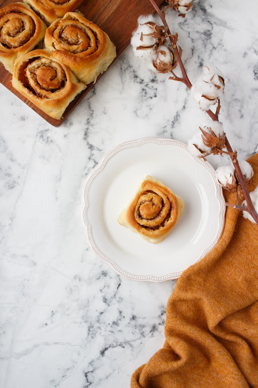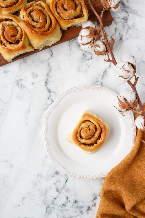 Skořicoví šneci s jablečnou náplní, to je moje další pocta podzimu. Jedeme teď doma na kynuté vlně a hned tak neskončíme. Slibuju, že se ještě máte na co těšit. Myslím, že není nikdo, kdo by nemiloval šneky z kynutého těsta, nadýchané a vláčné, vonící máslem a skořicí, a s jablíčky je to ještě větší blaho. Navíc si je můžete vylepšit přidáním rozinek naložených v rumu a nahrubo posekaných ořechů a polít je třeba karamelovou čokoládou nebo domácím slaným karamelem. Já jsem si tentokrát vystačila s jednoduchou cukrovou polevou, díky které se šneci po upečení krásně lesknou a jsou ještě vláčnější.