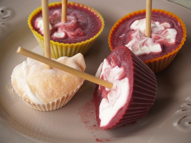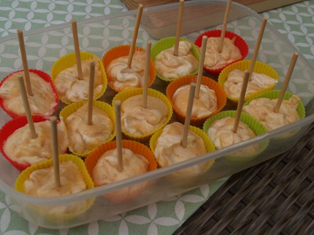 silikonové formičky, kelímky od jogurtů či jiné menší, ale plastové, nádobky naskládané v nízké misce pro snadnou manipulaci v mražáku