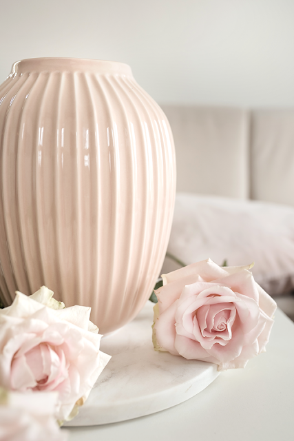 Ve váze jsem okamžitě viděla zahradní, velkokvěté růže. Jistě by jí slušely i pivoňky nebo hortenzie. Strohý nordic styl u mě už nějakou dobu ustupuje a čím dál víc obdivuji elegantní styl bydlení a prvky jako mramor, bílé dřevěné obložení a podobně. Tak bych chtěla jednou bydlet. A tuhle vázu tam přesně vidím.
