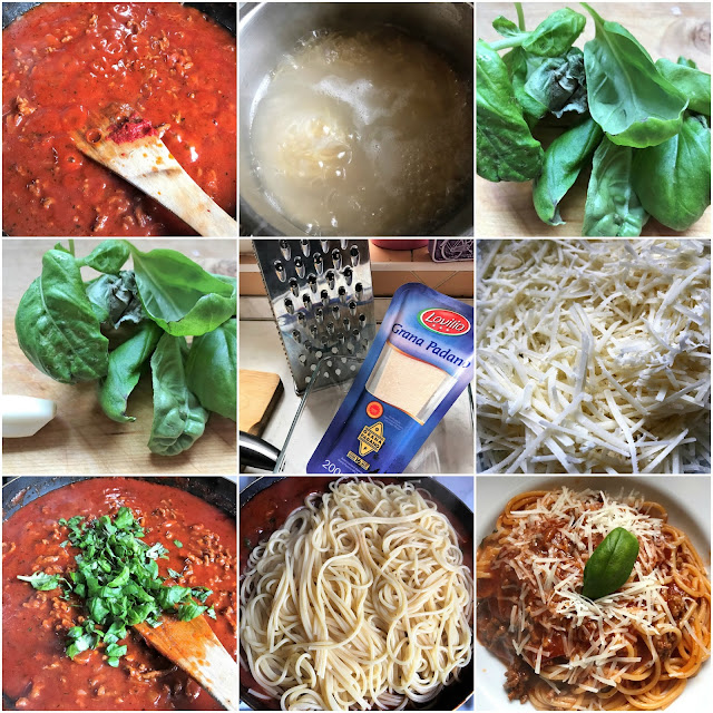 Ráda používám kvalitní rajčatový základ. Takový, který není hořký a podobá se nejvíce doma připravovanému rajskému základu z čerstvých masitých rajčat, bylin, česneku a olivového oleje a v tomto případě, dobré mleté hovězí maso. Někdo přidává červené víno, já jsem použila pár kapek citronu. Sůl, cukr (minimálně), mletý pepř, nadrobno nasekanou cibuli osmaženou dozlatova na olivovém oleji, stroužek česneku, olivový olej a hrst bylinek. Hrstičku sýru na závěr a přeji dobrou chuť!