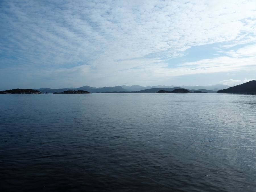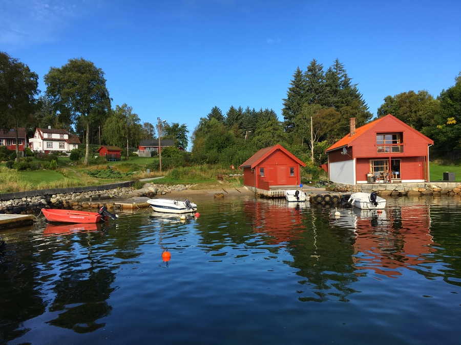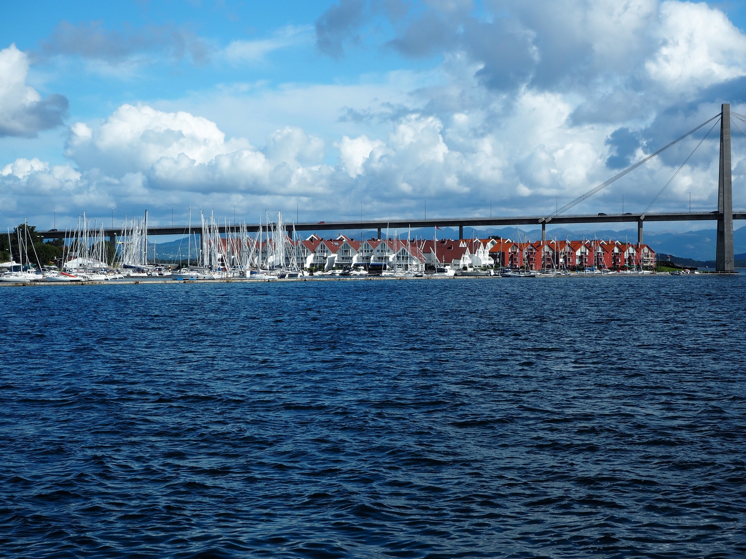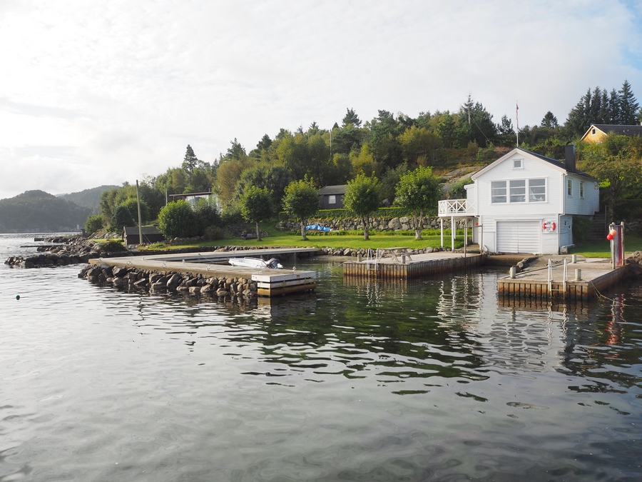 Přístav ve vesničce Hommersåk, kde jsme přestoupili na další trajekt. Mohli jsme tak chvilku pozorovat, jak si norové vychutnávají ráno. Bylo něco po osmé a my jsme pokukovali po postarším páru, jak vysedává na verandě svého srubu. Oba si četli noviny a popíjeli k tomu velmi distingovaně kávu. Bylo ticho a slyšet bylo jen šplouchání moře, sem tam nějaký racek. No, solidně jsem jim tuhle pohodu záviděla… Kdo by si nechtěl takhle ráno sednout k fjordu s úžasným výhledem na okolní ostrůvky?